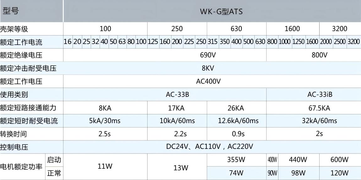 WK-G型自動(dòng)轉(zhuǎn)換開關(guān)是采用微電機(jī)驅(qū)動(dòng)兩個(gè)背靠背的負(fù)荷-隔離開關(guān),它能保證兩路電源帶負(fù)載轉(zhuǎn)換和安全隔離。它帶中間位,不帶短路及過載保護(hù),產(chǎn)品屬于PC級(jí),它能接通、承載,但不用于分?jǐn)喽搪冯娏鳌_m合用于交流50Hz、60Hz,交流額定電壓660V及以下、直流額定電壓440V及以下的供電系統(tǒng)。WK G型自動(dòng)轉(zhuǎn)換開關(guān)是集開關(guān)與控制于一體,無需外接控制器。基本型需另接二次線,可實(shí)現(xiàn)全自動(dòng)、自動(dòng)+遠(yuǎn)控(電動(dòng))、遠(yuǎn)控、自動(dòng)+遠(yuǎn)控+油機(jī)等多種功能。